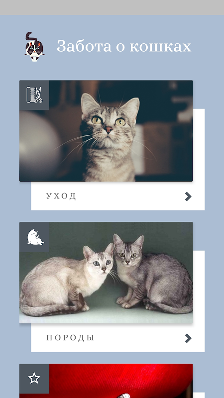 Приложение может быть использовано как читалка, которая будет всегда под рукой и будет помогать заботиться о вашей кошке или коте.