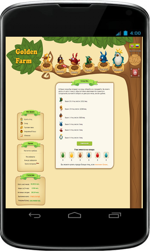 Сразу после покупки птиц вы будите автоматически получать с них яйца, посмотреть их количество можно в разделе "Склад" и там же собрать их для дальнейшей продажи за серебро и обмена его на реальные деньги.