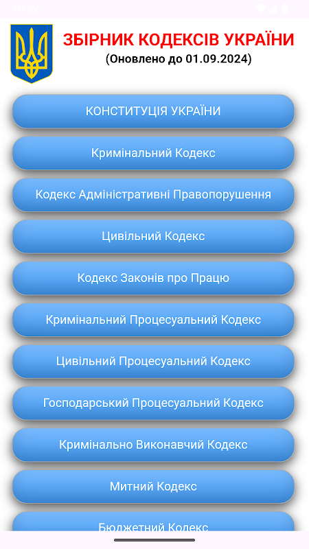 یوکرین کے کوڈز کا مجموعہ - اس ایپلی کیشن میں یوکرین کے تمام اہم قانون سازی کوڈز شامل ہیں، جو ذیل میں درج ہیں: