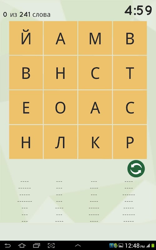 Главный экран держит вас в курсе о вашем прогрессе в игре. Другие интеллектуальные функции на экране игры поможет вам вести учет словами вы нашли и оставшееся время. Кроме того, следить за список слов вы нашли. Слова расположены в алфавитном порядке слева-сверху правой нижней.