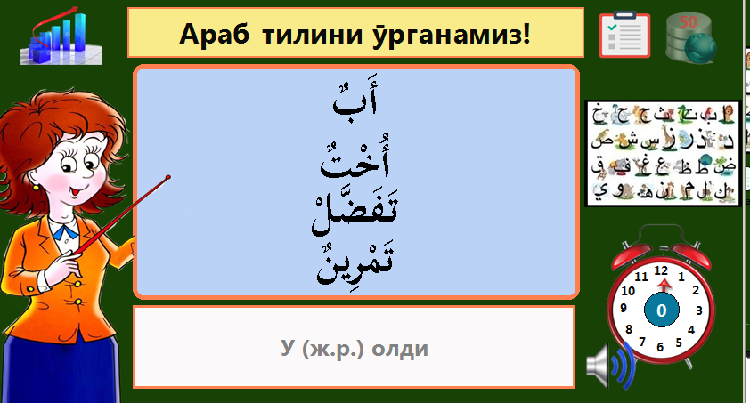 ہم عربی زبان (ازبک میں) پڑھتے ہیں۔ یہ ایپلیکیشن بچوں اور بڑوں کو ٹیسٹ گیمز کے ذریعے عربی زبان سکھانے کے لیے بنائی گئی ہے۔ بہت سی سطحیں اور مشکلات ہیں۔ سوالات کے جوابات دے کر ، آپ کو نئے مشکل سوالات وغیرہ کھولنے کا موقع ملے گا۔ ازبک بولنے والے صارفین کے لیے ڈیزائن کیا گیا ہے۔