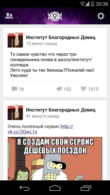 Данное приложение является клиентом для просмотра публичной страницы Институт Благородных Девиц в ВКонтакте. Приложение повторяет основные возможности работы с контентом в ВК.