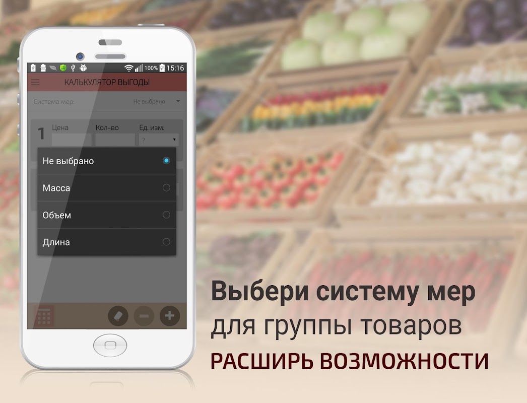 Используя приложение "Калькулятор выгоды", можете быть уверены, что совершаете выгодные покупки.