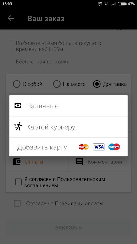 Выберите способ оплаты: Наличными или картой. Примите правила оплаты и нажмите кнопку “Заказать”.