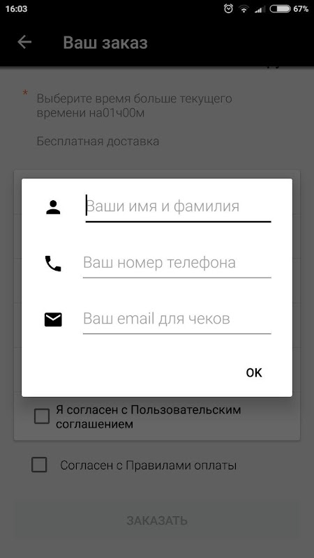 На экране заказа добавьте свою контактную информацию для первого заказа: Имя, Номер телефона и адрес электронной почты, чтобы получать уведомления об оплате.
