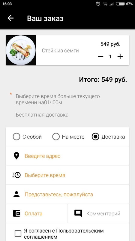 Укажите время, когда хотите прийти за своим заказом или выберите доставку с указанием времени и адреса доставки.
