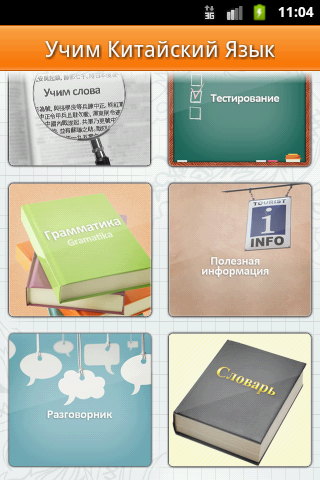 В программу входят уроки, тесты, разговорник, словарь китайско-русский и русско-китайский, грамматика, полезная информация а так-же карта с лучшими достопримечательностями Китая и и все это не требует подключения к сети Интернет!