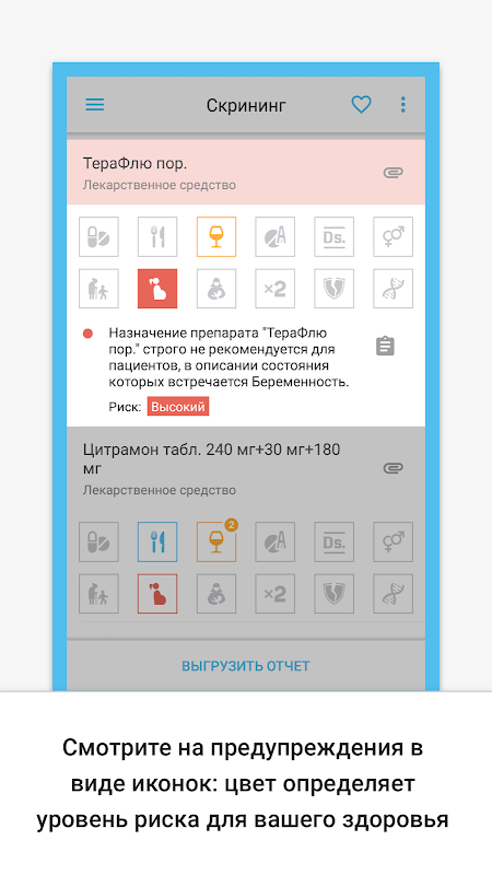 Установите бесплатно приложение и проверьте противопоказания назначенных вам препаратов по 12 факторам: