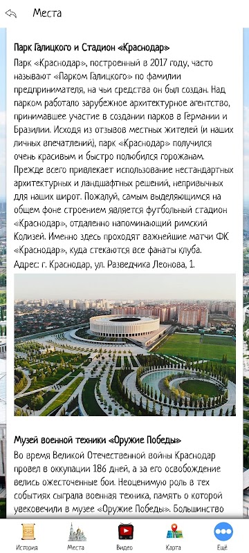 درخواست میں، آپ کراسنوڈار شہر سے پہلی واقفیت کر سکتے ہیں، مقامات اور ویڈیو کے جائزے دیکھ کر سفر کے لیے جگہ کا انتخاب کر سکتے ہیں۔ ایپلی کیشن میں ٹور ایجنسیوں اور ہوٹلوں کے بارے میں بھی معلومات شامل ہیں جو کراسنوڈار میں اپنی خدمات پیش کرتے ہیں۔