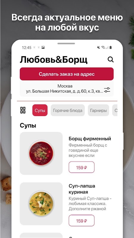 کھانا پکانے کے مینو "لیوبوف اینڈ بورشچ" میں گھر میں پکے ہوئے پکوان شامل ہیں جو بچپن سے ہی ہر کوئی واقف ہے۔ ہم نے پورے روس سے بہترین ترکیبیں اکٹھی کی ہیں، انہیں شیف کے دستخطی پکوانوں کے ساتھ ساتھ قدرتی اجزا سے بنی گھریلو پیسٹری اور میٹھے بھی شامل کیے ہیں۔