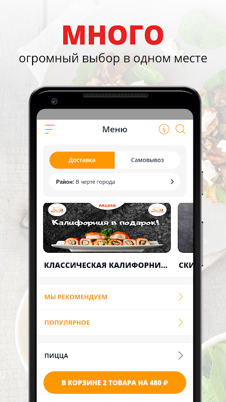 Вкусная еда теперь всегда под рукой: свежие суши, роллы, сеты, лапша с овощами, супы, салаты, пицца и напитки.