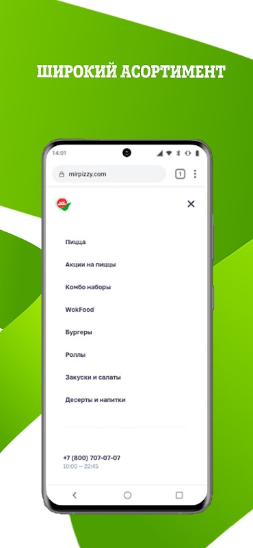 ایپلیکیشن آئیکن پر صرف ایک کلک کریں، اور آپ پہلے ہی آرڈر دے سکتے ہیں! پیزا ورلڈ کی ویب سائٹ کو کال کرنے یا تلاش کرنے کی ضرورت نہیں ہے۔ ایک کلک - اور آپ کے پاس پہلے سے ہی تمام موجودہ پوزیشنوں کے ساتھ ایک مکمل مینو ہے!