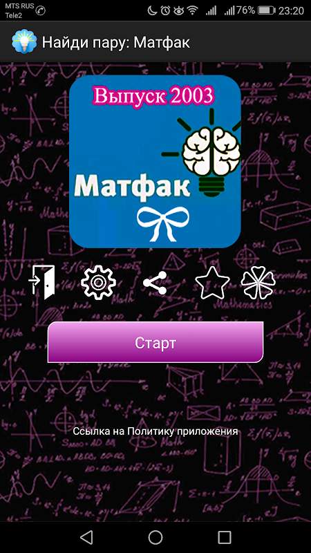 v1.4 Привет всему МАТФАК-у, а особенно выпуску 2003 ))). Приложение именно для вас! После прохождения 10-го и 12-го уровня вас ждет небольшой приятный БОНУС!