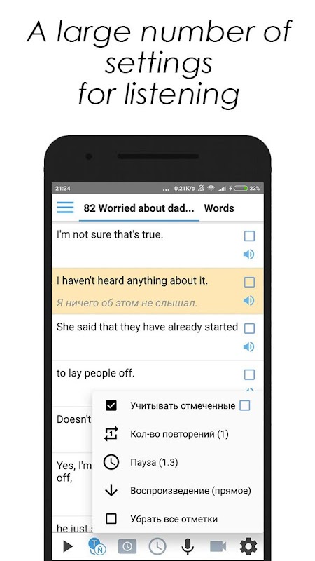 Special audio player for listening. You can easily listen to conversations, videos, movies or TV shows.