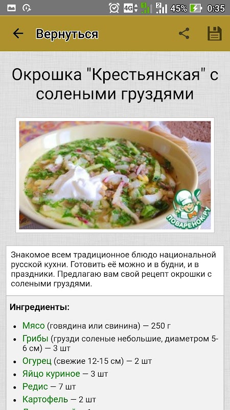 Открывайте для себя новые рецепты столь привычного блюда, как окрошка! А если какой-то из них вам приглянулся – не спешите переписывать его в тетрадь. Лучше добавьте его в собственную кулинарную книгу – там он всегда будет в целости и сохранности!