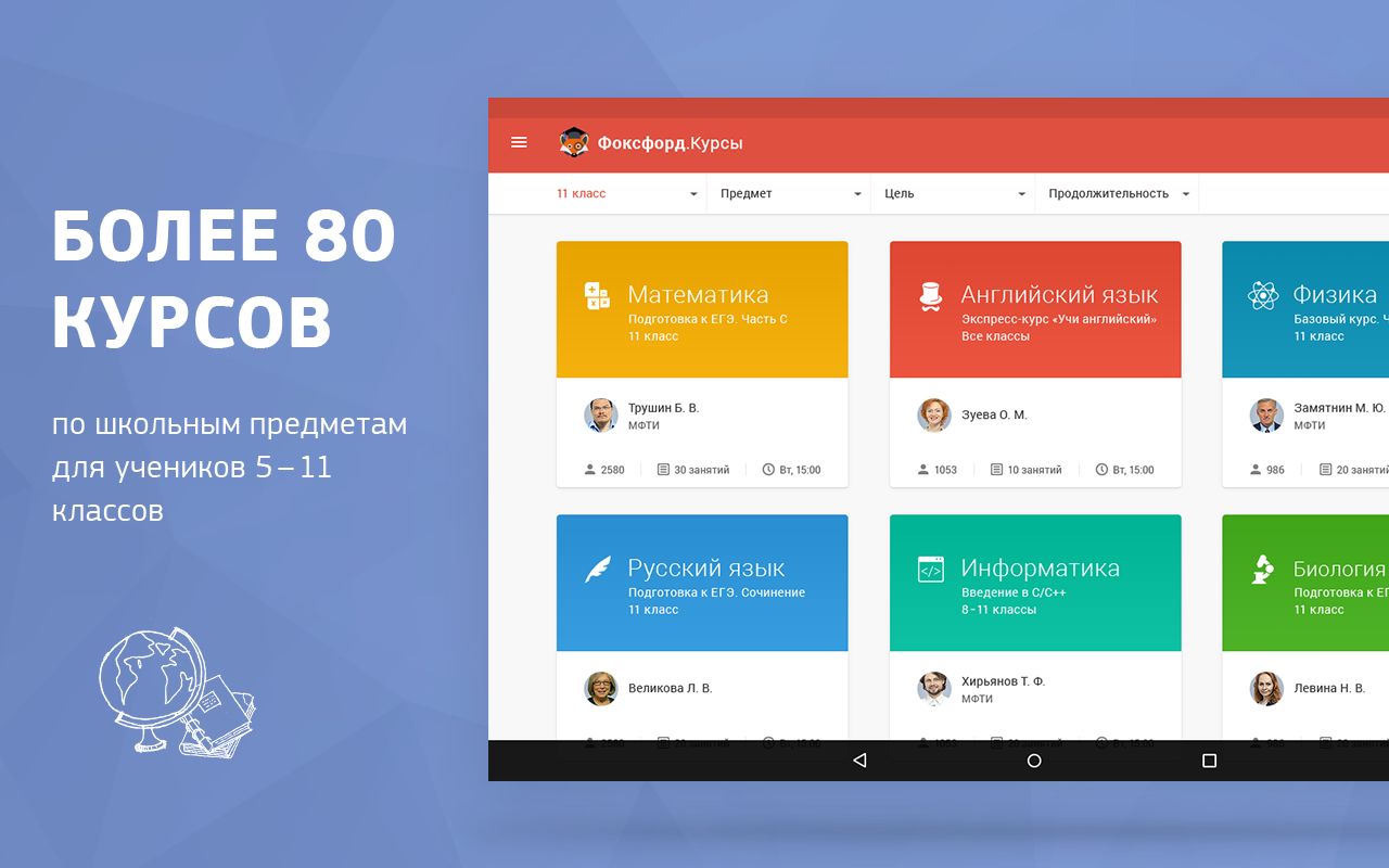 Занятия ведут преподаватели МГУ, МФТИ, ВШЭ и других ведущих вузов страны. Уже 15000 учеников окончили Фоксфорд и получили +25 баллов по ЕГЭ относительно средних результатов по стране.