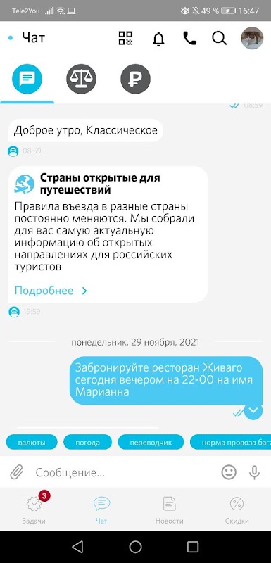 دربان سروس کے ذریعے تمام درخواستوں اور خریداریوں کی تاریخ "ٹاسک" اور "اکاؤنٹس" سیکشنز میں محفوظ ہے۔ "خبریں" میں - سفر اور ثقافت کے میدان سے تازہ ترین، ساتھ ہی واقعات کا کیلنڈر، جس کے ساتھ آپ مہینے کے لیے اپنا شیڈول بنا سکتے ہیں۔ مسلسل اپ ڈیٹ ہونے والا سیکشن "ڈسکاؤنٹس" آپ کو دلچسپ پیشکشوں اور مراعات کے بارے میں بتائے گا۔