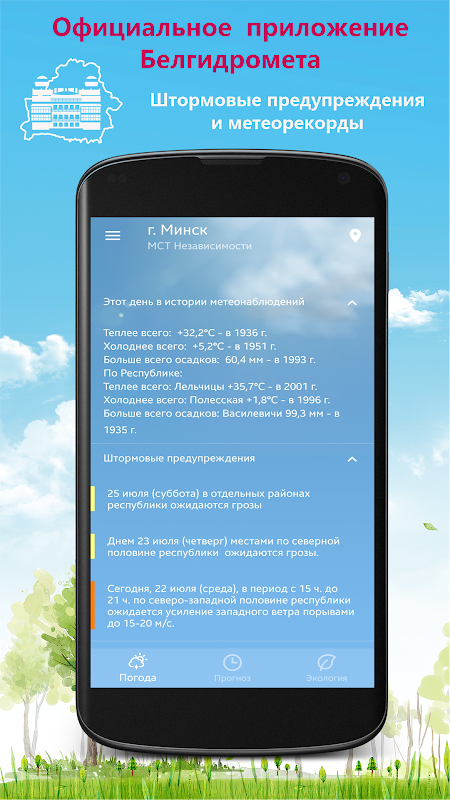 "ویٹر ان پوکٹ" صارف کو جمہوریہ بیلاروس کی بستیوں میں موسم ، ہائیڈروولوجیکل ، زرعی ماہر علمی اور تابکاری ماحولیاتی حالات کے بارے میں معلومات فراہم کرتا ہے۔ یہ معلومات ریاستی نگرانی کے نیٹ ورک بیلہائیڈروومٹ کے نکات پر پیمائش کے اعداد و شمار کی خود کار طریقے سے کارروائی کا نتیجہ ہے۔