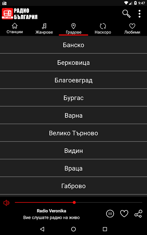 آپ اپنے فون پر مشہور بلغاریائی ریڈیو اسٹیشنوں کی فہرست آن لائن تلاش کر سکتے ہیں، شہر یا صنف کا انتخاب کر سکتے ہیں۔ ریڈیو اسٹیشنوں کی فہرست ایپلی کیشن میں ان کی مقبولیت کے لحاظ سے ترتیب دی گئی ہے۔ جیسے ہی آپ اپنا پسندیدہ ریڈیو اسٹیشن منتخب کریں گے اور "رن" دبائیں گے، ایپلی کیشن پس منظر میں کام کرتی رہے گی، جب کہ آپ اپنا فون استعمال کرنے کے لیے آزاد ہوں گے۔