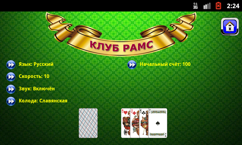 Азартная карточная игра "Рамс", популярная в России. Вкратце, цель игры заключается в том, чтобы быстрее остальных списать очки, пытаясь брать взятки с тузами. Сыграв 25 конов при хорошем счёте игрок попадает как в локальную таблицу чемпионов, так и в мировую. Можно выбрать одну из трех любимых советских колод: Атласную, Майя или Славянскую. Требуется размер экрана 800x480 или лучший. Поддерживаемые языки: English + Русский.