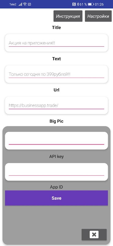 Отправляйте PUSH уведомлений в 1 клик прямо со своего мобильного телефона.