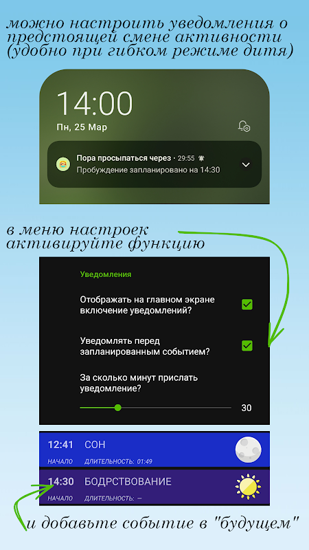 - نیند اور بیداری کا تفصیلی تجزیہ آپ کو اپنے بچے اور آپ کے لیے ایک آرام دہ روزمرہ کا معمول بنانے میں مدد کرے گا۔