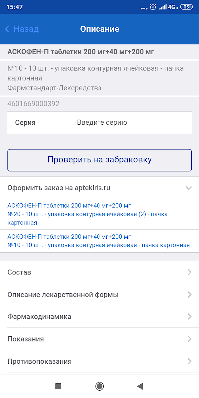 • найти описания лекарственных средств по штрихкоду на упаковке (при их наличии в базе);