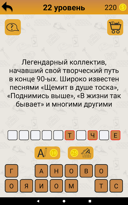 В игре свыше двухсот уровней! Пройдите длинный путь, отвечая на вопросы по русскому рэпу по нарастающей сложности!