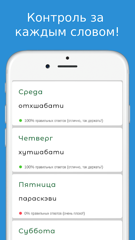 منتخب کردہ عنوان پر امتحان پاس کرنے کے بعد ، آپ غلطیاں دیکھ سکتے ہیں۔ نیز ، ہر ایک عنوان سے امتحان پاس کرنے کا نتیجہ محفوظ ہوجاتا ہے ، آپ کا مقصد یہ ہے کہ منتخب کردہ عنوان کے سارے الفاظ 100. سے سیکھیں۔