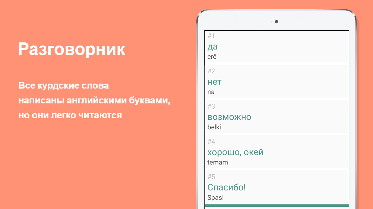 اس مفت ٹیوٹوریل کو جملے والی کتاب اور کرد زبان سیکھنے کے ایک آلے کے طور پر استعمال کیا جاسکتا ہے۔ تمام کرد الفاظ روسی حروف میں لکھے گئے ہیں ، یعنی فقرے کی کتاب روسی بولنے والے صارف کے لئے تیار کی گئی ہے۔