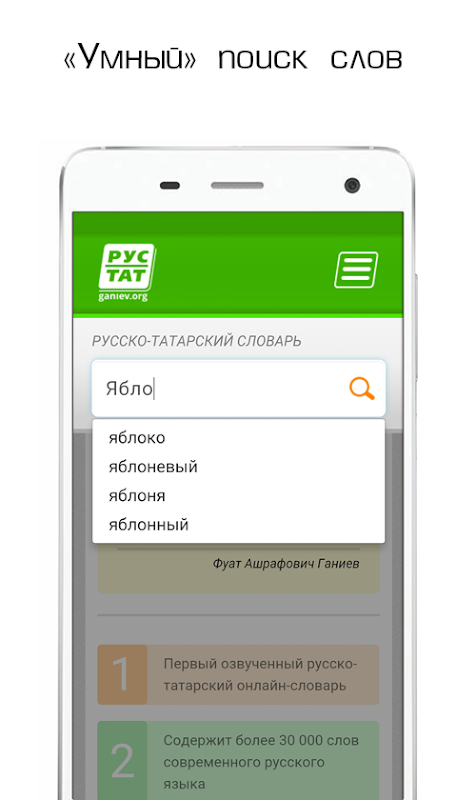 Учите татарский язык с Русско-татарским словарём Ганиева Ф. А.! С ним всего за секунду русскоязычный пользователь может узнать значение русского слова в любой точке планеты в удобное для себя время. Словарь Ганиева впервые предлагает пользователю озвученный перевод каждого слова. Словарь Ганиева - самый большой из озвученных русско-татарских интернет-словарей. У Словаря Ганиева простой и понятный интерфейс. Читайте, слушайте, запоминайте!