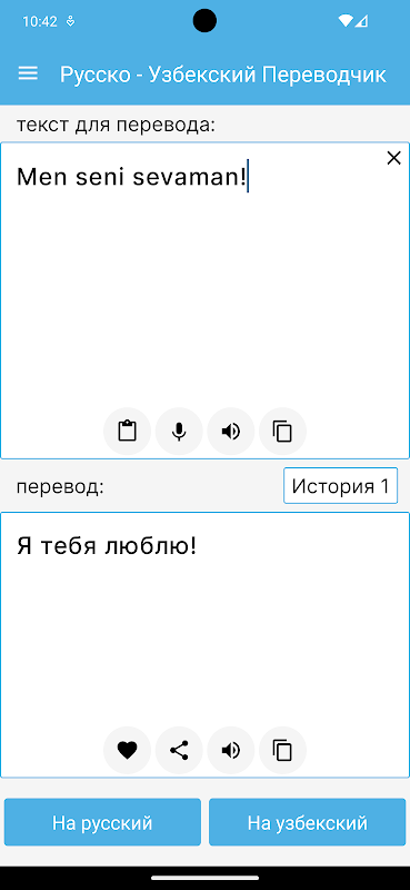 آپ الفاظ اور متن کا ازبک سے روسی اور روسی سے ازبک میں آسانی سے ترجمہ کر سکتے ہیں۔ آپ صرف ایک سیکنڈ میں الفاظ اور یہاں تک کہ جملوں کا ترجمہ بھی کر سکتے ہیں۔ لغت کے طور پر استعمال کیا جا سکتا ہے۔