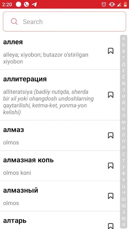 یہ روسی-ازبک اور ازبک-روسی ڈکشنری نوجوانوں، شاگردوں، طلباء کے روسی یا ازبک زبان کے طلباء کے لیے بنائی گئی ہے اور ایک مشترکہ ڈیٹا بیس میں 30,000 سے زیادہ لائنیں اور تقریباً 50 ہزار الفاظ پر مشتمل ہے۔ لغت آف لائن کام کرتی ہے اور اسے استعمال کرنے کے لیے انٹرنیٹ کی ضرورت نہیں ہے۔