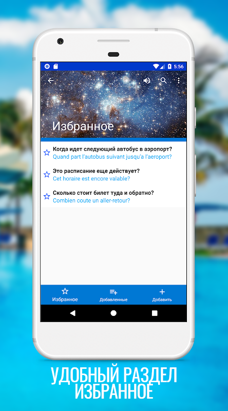 Русско - Французский разговорник также поможет вам в изучении и усовершенствовании языка: фразы возможно сохранять в разделе «Избранное» для быстрого доступа и дальнейшей практики произношения.