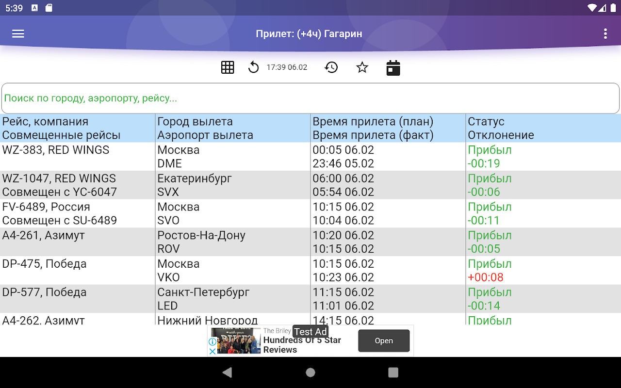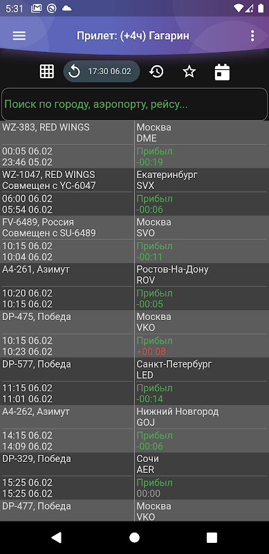 Gagarin ہوائی اڈے کی ایک غیر سرکاری درخواست، ہوائی جہاز کی روانگی اور آمد کے بارے میں معلومات فراہم کرتی ہے۔ مزید پرواز کے نظام الاوقات اور دیگر مفید معلومات۔ اسکور بورڈ لائن کو توسیع شدہ معلوماتی اسکرین میں پھیلانا ممکن ہے۔