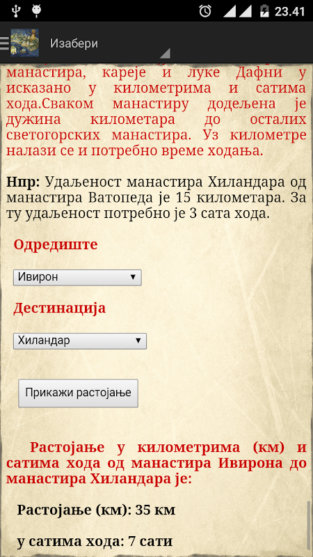 یہاں ، صارف کو خانقاہ کے فاصلہ کو آسانی سے اور جلدی سے طے کرنے کا موقع فراہم کیا گیا ہے اور یہ کہ منزل سے منزل تک کتنے گھنٹے چلنا چاہئے۔ مینو سے سیدھے منزل اور منزل کا انتخاب کریں اور شو کے بٹن پر کلک کریں۔ (ماؤنٹ ایتھوس کی کتاب سے - ماؤنٹ ایتھوس خانقاہوں کے فاصلے کی میز کلومیٹر اور گھنٹوں چلنے کے اظہار میں)۔