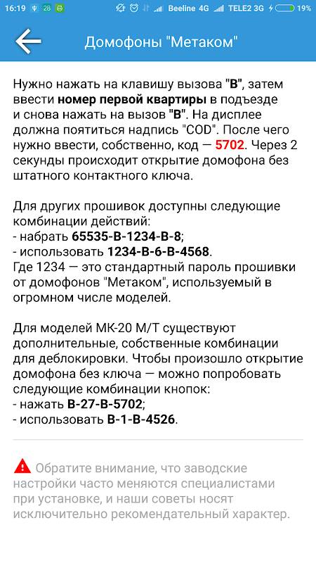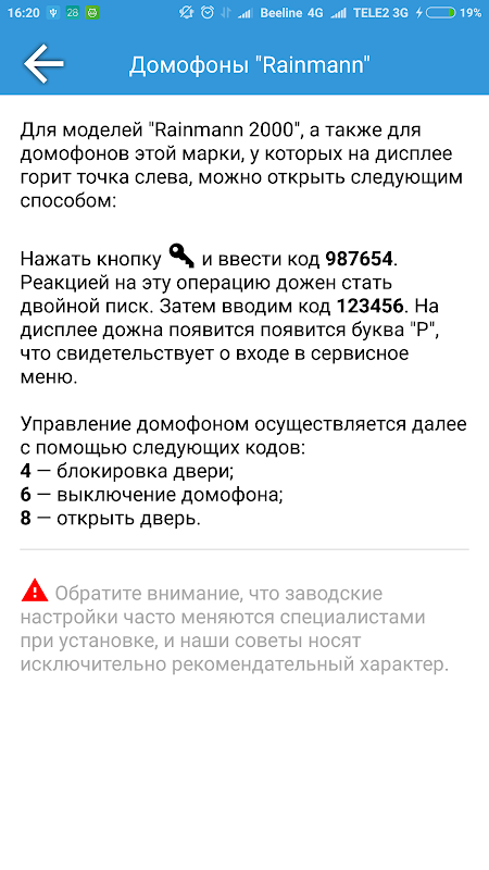 اس ایپلی کیشن میں رسائی کے ڈور فونز کے مشہور ماڈلز کو سروس کوڈ (کبھی کبھی خفیہ کوڈ بھی کہا جاتا ہے) کے بارے میں معلومات موجود ہیں۔ اگر انسٹالر کے ذریعہ اشارہ کردہ کوڈز کو تبدیل نہیں کیا گیا ہے ، تو زیادہ تر معاملات میں آپ ان کوڈوں کا استعمال کرتے ہوئے بغیر کسی خاص ٹولز کا استعمال کیے بغیر چابی کے بغیر انٹرکام کھول سکتے ہیں۔