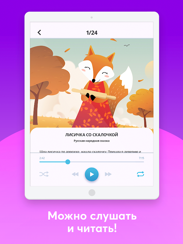 Это те самые сказки, которые читали нам наши мамы и бабушки. Теперь Вы можете познакомить и своего ребенка с этими полными мудрости сказочными историями. Традиционно эти сказки рассказывают на ночь, но Вы можете использовать их, чтобы занять своего малыша, например, в длинной поездкe. Все сказки сопровождены аудио, поэтому если Ваш ребенок пока не умеет читать, он может просто послушать сказку. Дети постарше могут слушать и следить за текстом, что на начальном этапе обучения улучшает навыки чтения. Так же мы подобрали для Вас несколько колыбельных, которые Вы сможете спеть своему малышу на ночь, и несколько классических мелодий, которые помогут ему успокоиться и заснуть.