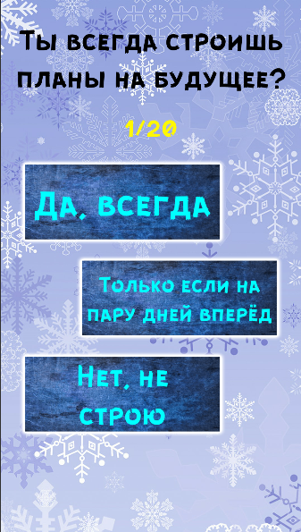Новый год уже скоро! Перед вами коллекция тестов на новый год. Здесь вы сможете получить ответы на ваши вопросы! Что меня ждёт в следующем году? Ждёт ли меня любовь? Ждут ли меня новые отношения с парнем или девушкой? Что ждёт моих друзей? Какие подарки попросить у Деда Мороза? Практичные книги или телефон, новые игрушки, купон в необычное место или необычный сувенир? Всё это ждёт вас в наших тестах на Новых Год! Также внутри есть разыгрыш - пранк "Письмо деду морозу". Заполните поля и получите интересный и смешной результат!