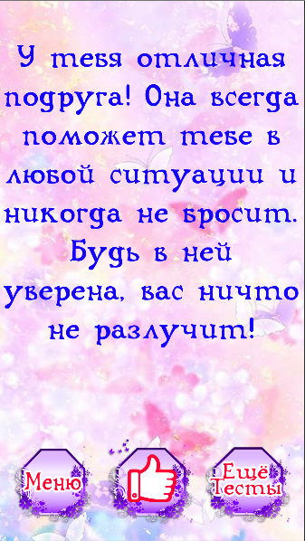 Множество интересных вопросов, необычных ответов и неожиданных результатов... всё это ждёт тебя в тесте "Проверь свою подругу"!