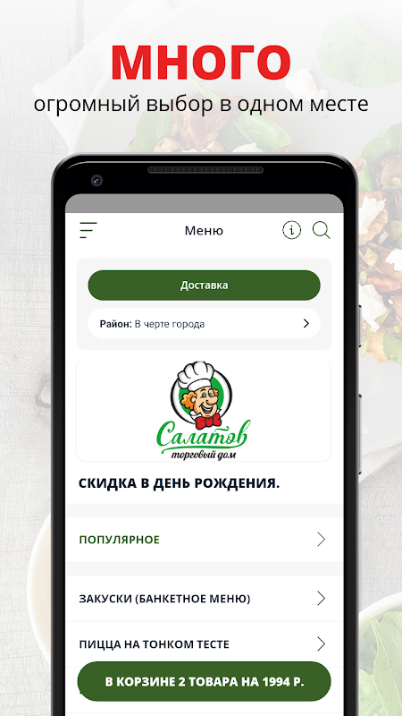 2003 سے ٹریڈنگ ہاؤس سالاتوف ایل ایل سی اعلیٰ معیار کی، صحت مند اور جو اہم ہے، مزیدار کھانے کی مصنوعات تیار کر رہا ہے: تازہ سلاد، گلابی پیسٹری، قومی چک چک، روشن انڈے کے نوڈلز، مختلف فلنگز کے ساتھ مزیدار پائیز اور مشہور پیزا۔ اب آپ اپنے گھر یا دفتر میں ڈیلیوری کے ساتھ تیار کھانے کا آرڈر دے سکتے ہیں - صرف چند کلکس!