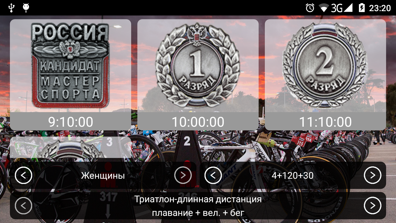 Если вы хотите знать с каким временем вам нужно завершить соревнование, чтобы получить спортивный разряд или спортивное звание по триатлону эта программа будет вам весьма кстати.