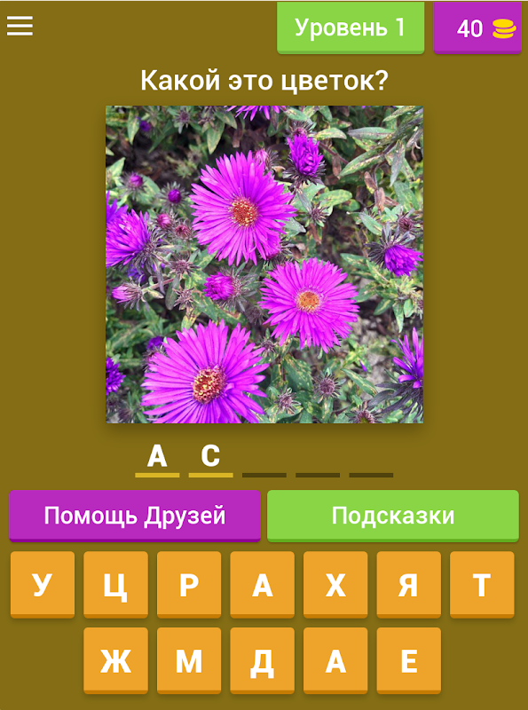 Угадай цветок – увлекательная и познавательная игра для людей любого возраста. Вам нужно будет вспомнить, как называется цветок, изображение которого Вы увидите на экране вашего устройства. В игровом поле представлены как известные всем цветы, так и не очень.Суть игры состоит в том, чтобы подобрать из букв представленных внизу игрового поля, подходящие к картинкам названия цветов.Если слово составлено правильно, вы получаете награду и переходите на новый уровень.Когда у вас закончатся монеты, вы их можете пополнить, нажав на иконку монеток.