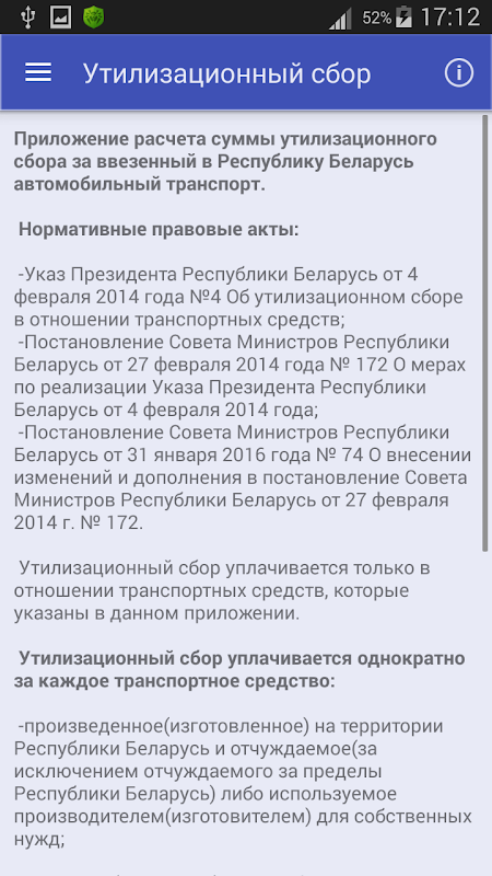 Приложение рассчитывает сумму утилизационного сбора за ввезенный в Республику Беларусь автомобильный транспорт в соответствии с действующими нормативными правовыми актами Республики Беларусь.