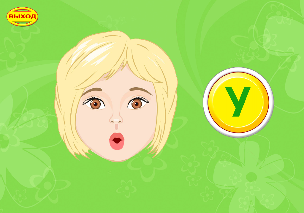 Первое приложение из серии для изучения звуков. Диктор предлагает ребенку послушать и посмотреть, как правильно произносить изучаемый звук. Анимированное изображение лица девочки показывает правильную артикуляцию при произнесении звука (положение губ, языка, степень раскрытия рта). Затем диктор просит малыша несколько раз произнести звук, смотря на анимированное изображение.