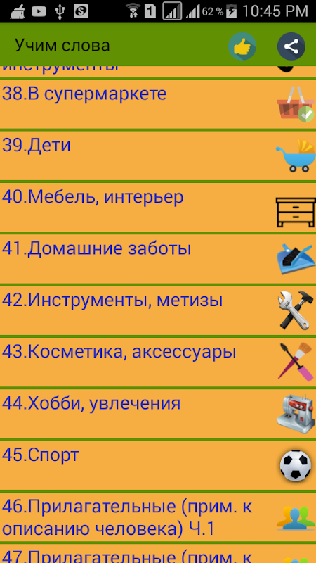 Приложение «Учим слова на английском» станет незаменимым помощником для всех, кто начинает изучать английский язык, а также для тех, кто уже имеет начальный уровень знаний. Благодаря приложению Вы сможете выучить большое количество слов, которые для Вашего удобства сгруппированы на темы.