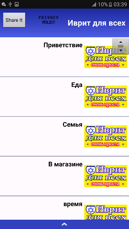 Приложение Учить иврит быстро станет незаменимым помощником для всех, кто начинает изучать один из красивейших языков мира, а также для тех, кто уже имеет начальный уровень знаний. Благодаря приложению Вы сможете выучить новые слова, которые для Вашего удобства сгруппированы на темы.
