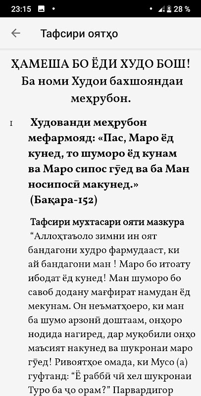 Худованди меҳрубон мефармояд: «Пас, Маро ёд кунед, то шуморо ёд кунам ва Маро сипос гӯед ва ба Ман носипосӣ макунед.»