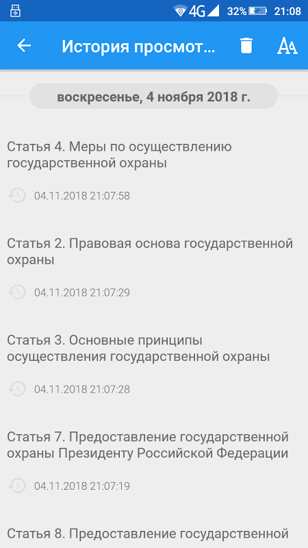 - История просмотров: приложение хранит историю просмотра статей, формируя список и сортирую историю по дате просмотра