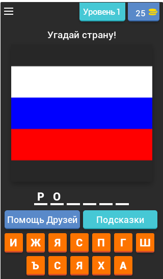 Наша образовательная викторина покажет тебе флаг страны, а ты должен угадать или вспомнить название страны и нажать на правильные буквы в ответе.